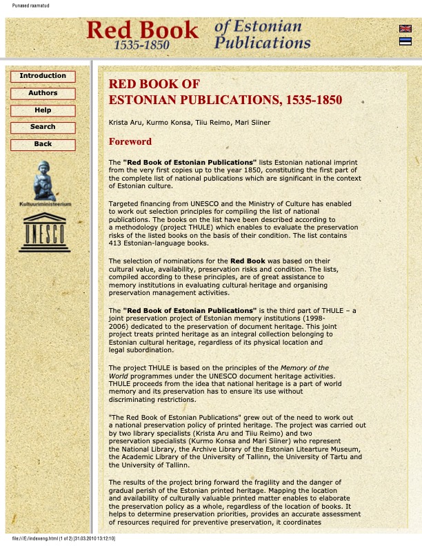 Stage I (2001–2006) involved work on books from the years 1535–1850 (the original list contained 413 books). The working group consisted of Krista Aru, Estonian Literary Museum; Kurmo Konsa, University of Tartu; Tiiu Reimo, Tallinn University / Academic Library of Tallinn University; and Mari Siiner, National Library of Estonia (coordinator). The aforementioned institutions, along with the Tallinn City Archives, the Estonian Historical Archives, the Läänemaa Museum, the Conservation Centre Kanut, and Vallo Raun, contributed to the completion of the work. The project was made possible through targeted funding from UNESCO and the Estonian Ministry of Culture.
